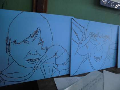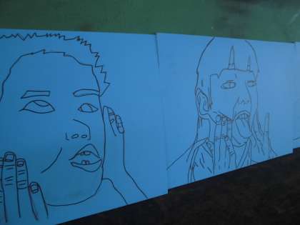 いろいろな「ゆがみ」を出した顔を木版画で表現します。