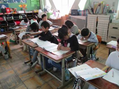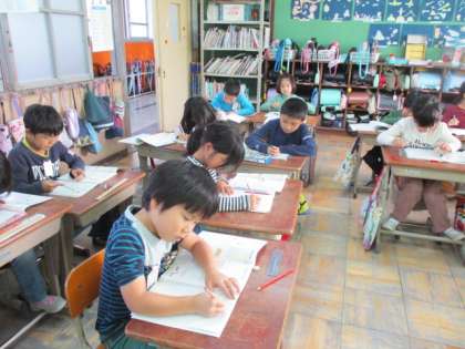 算数科では,かけ算の学習が進んでいます。4のだんが終わり,九九を使った文章問題を練習しています。1つ分の数といくつ分になるかを見つけ,式を考えています。