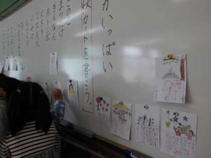 もうすっかり秋です。日が暮れるのが早くなり,虫の音が夜長を楽しませてくれる秋です。秋の言葉を集めて秋カードを書きました。子どもたちの秋は,どんな秋なのでしょうか。