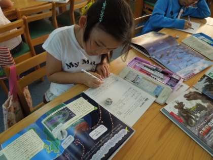 「ものしりはかせ」になるために,ほんのもりに来た時,10〜15分で,図かんを使って調べています。「さくいん」や「もくじ」を見て自分の調べたいものをみつけます。記録は「読書ノートの形式」(P17)を使っています。