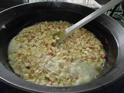 りんごをうすくきって,とかした寒天液に入れてつくりました。オレンジジュースの寒天にいちょう切りのりんごが浮かび,きれいな色どりに仕上がりました。