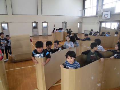 大きな段ボールをつなぎ合わせ,輪を作りその中に,子どもたちが入って歩きます。段ボールの電車の完成です。