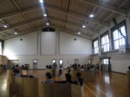 体育館に元気な声が響きます!絵を描く前に素材で遊ぼう!