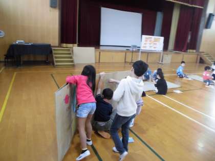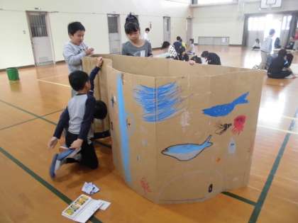 おや〜っ!平面に置かれた段ボールキャンパスが・・・!立ち上がってきました。先生は何も言いません。子どもたちが自然に,段ボールを立ち上げ立体作品へと変貌させていきまいした。面白いなあ!