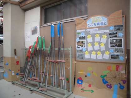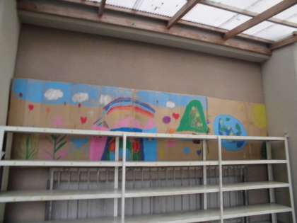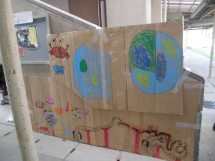 描いた絵が体育館周囲に飾られています。是非,来校の際にはご覧ください。キャンパスが段ボールですので,期間限定展示になります。