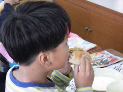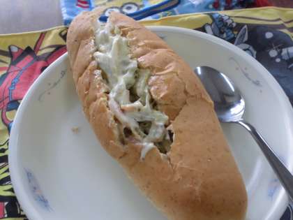 コッペパンに上手に中身をはさみ,野菜ホットドックを作ります。小さいおかずにマヨネーズを混ぜて,中身を完成させます。人によっては,コッペパンと野菜サラダを分けて食べますが,それはお好みで★楽しい給食は最高です。