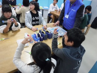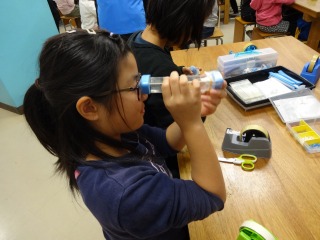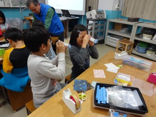 万華鏡が出来上がると「きれい!」や「いい感じにできたわ!」と満足した表情でした。中身も自分でカスタマイズできるそうです。また,お家でも使ってみてください。