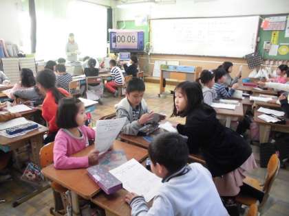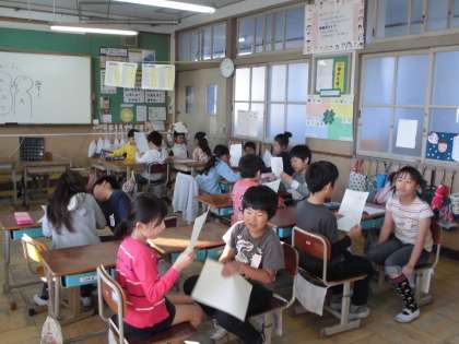 町探検でインタビューをさせていただいたお店のことを友達に話す活動をしました。ペアで話したり,班で話したりと話し合いの方法はクラスによって違いますが,どのクラスもお店のことをお友達に教えてあげることができていました。