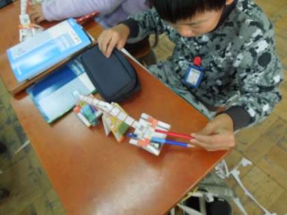算数の学習では,てんびんを作りました。手作りのてんびんでえんぴつや消しゴムなど文房具の重さを比べました。