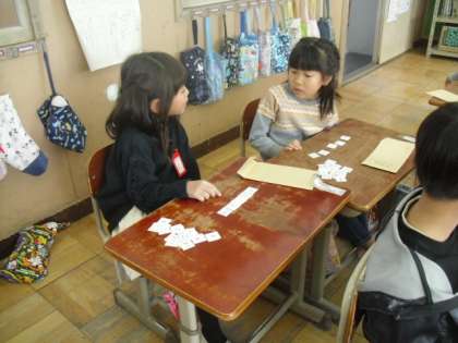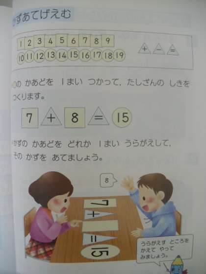算数では、たしざんとひきざんのまとめで、数あてゲームをしました。