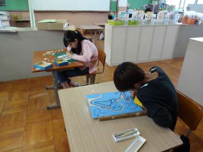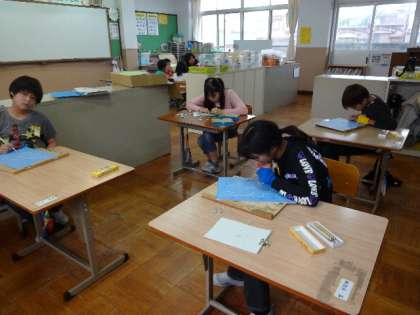 木版画の完成に向けて日々取り組んでいます。彫刻刀の使い方にも慣れてきて,集中して取り組む様子が見られます。高学年は彫刻刀も使い分けて使っています。学年ごとにそれぞれの作品に向けて頑張っています!