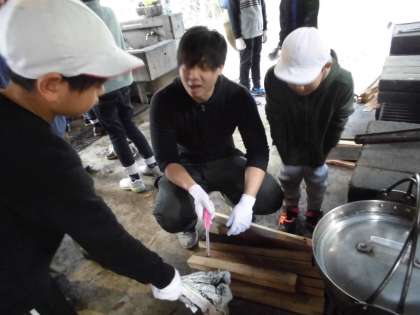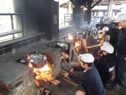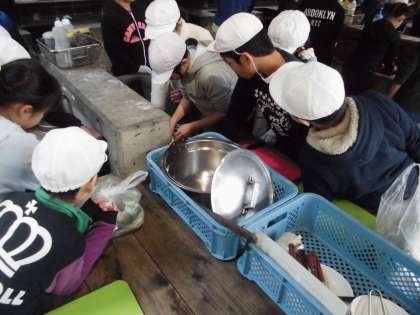 昼食は野外炊事での「豚汁」