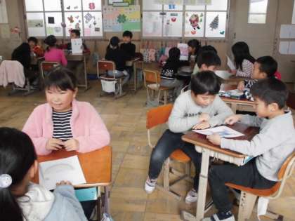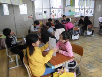 ペアで話し合いました。完成品の発表会でもあり,質疑応答ができる最後の話し合いです。できる限り多くの発明品を知れるように,円での話し合いに挑戦しました。