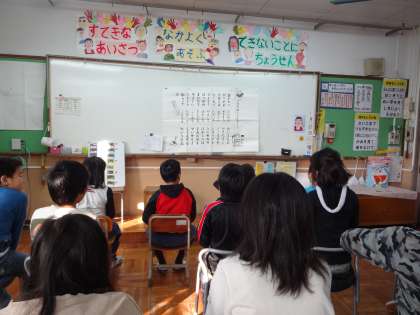 朝の会で「1月のあいうえお歌」の詩をみんなで読んでいます。朝から元気いっぱいの声が響いていました。