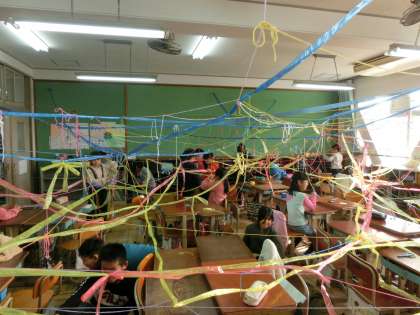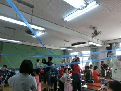 ひものつなぎ方や結び方を工夫して,教室という場所の様子を変えていきました。