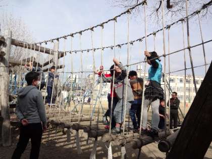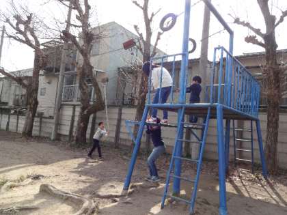 作品の紹介がおわってからいろんな学校と友達と交流しながら遊びました。教室では,踊りや新聞ジャンケンをしました。グランドでは,太秦小学校の遊具で遊びました。梅津小にはない遊具も多く,子どもたちも楽しそうに遊んでいました。