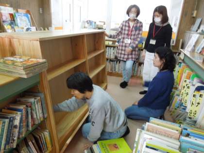 京都市教育委員会より3本の書架をいただきました。古い書架を出し,さっそく本の入替えです。うめのこのボランティアの方がたくさん来てくださり,スムーズに出来ました。こうめルームの雰囲気が少し変わりました。