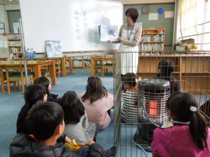 ストーブ音前で読みかたりをしてもらいました。
