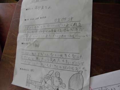 0〜3歳・4〜6歳と2回に分けてお家の方にインタビューをしました。詳しく話を聞き,自分の幼い時代を思い出します。