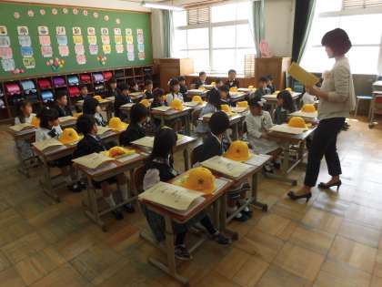 新入生が新しい教室,新しい机に座って,先生のお話を聞いています。