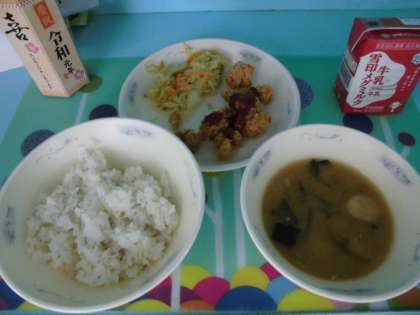 今日は,こどもの日のお祝い献立として【チキンカツ・ソテー・みそ汁】でした。