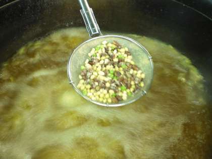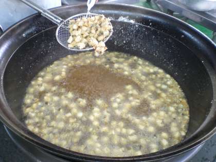 給食室では,ミックスビーンズに米粉と片くり粉をまぶして油で揚げたものと下味につけた たらに米粉と片くり粉をまぶして揚げたものを釜に入れ,さとう・トマトケチャップ・ウスターソースを合わせたソースをからめて仕上げました。