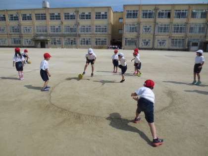 1年生の小さな手で,ボールを転がすのは難しい…