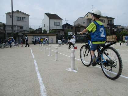 そうすることで卒業までに全員が自転車の安全な乗り方の学習をすることができます。梅津交通安全推進会や梅津自治会連合会の方々にご協力を賜り,朝早くから準備など運営のご支援をいただいきました。御礼申し上げます。また,右京警察や右京交通安全推進会婦人部の方にもご支援をいただいて技能試験をすることができました。子どもたちも一生懸命,教えていただいた通りに自転車に乗っていました。