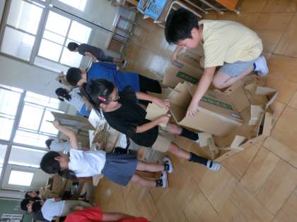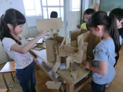 だんボールに切り込みを入れてつなげていくというシンプルな活動ですが,切り込みの入れ方や組み合わせ方で,強度が変わってきたり,空間の広がり方が違ってきます。