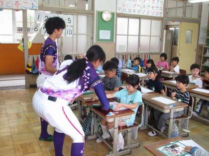 女子プロ野球「フローラ」のチームの選手が,梅津小学校に来てくれました。