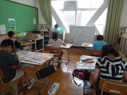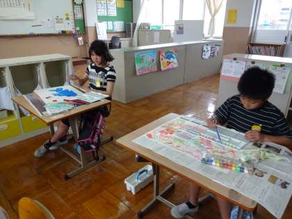 「こんな魚がいるとおもしろい」「こんな魚がいてほしい」などいろんなことを考えてオリジナルの魚を書きました。絵具やクレパスを使ってのびのびと描くことができました。