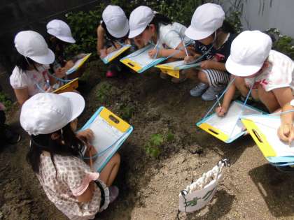 「さわってみるとトゲトゲしていたよ。」「ここだけ色がちょっと違うな。」と友達と話したり,葉の色や形,くきの様子などをじっくり見たりしながら,発見したことを観察カードにかいていきました。