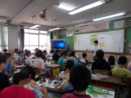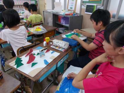 図工科において『糸のこスイスイ』の作品を完成させました。紙や木で作った部品をボンドで台紙に貼り合わせました。形はいろいろ,色とりどりな素敵な作品を作り上げることができました。