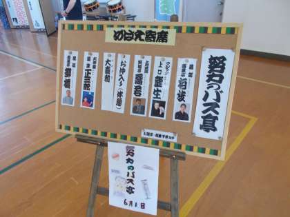 今日は『努力のバス亭』,本番でした。今日の本番に向けて,5・6年生は前座班や会場班,おはやし班などの子どもたちが準備・練習をしたり,ポスターやこばなしなど希望者の子どもたちが進んで制作を進めたりしてきてくれました。
