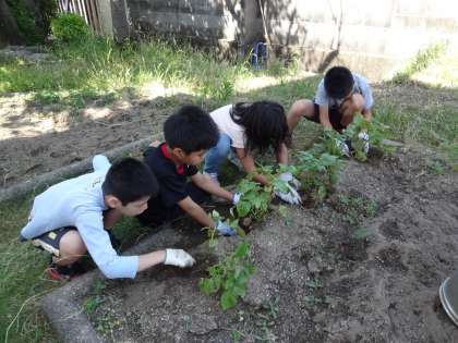 じゃがいもの収穫をしました。軍手をしてやさしく土をほっていくとコロコロとじゃがいものが出てきました。大きさは大小さまざまでしたが,たくさん収穫することができました。