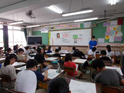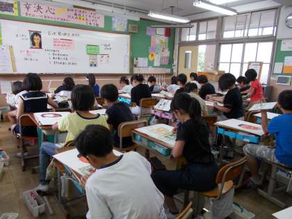 図工科において,『じっと見つめてみると』の学習を行いました。先週手鏡を見ながら,自画像を画用紙に描きました。また,自分の生活や身の回りを見つめて何か感じたり,人に伝えたりしたい情景を自分の周りに描きました。