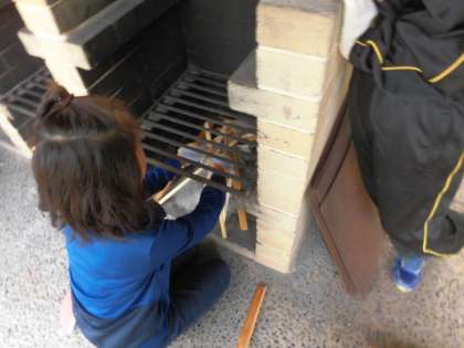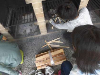 手際よく,かまど係が手際よく,薪を組み火をつけようとしています。