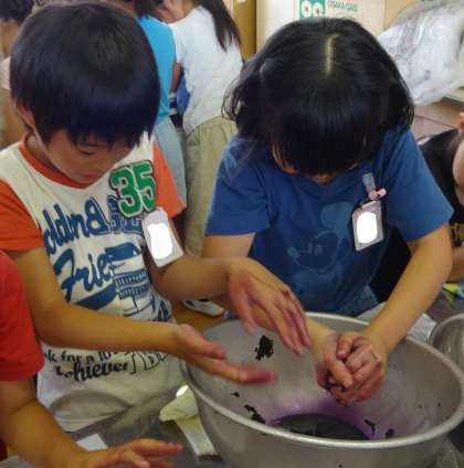 しその葉をよくもんでいくと,きれいな紫色の汁がたくさん出てきました。手に力を入れてぎゅっぎゅっともみ,葉の水分を出し切りました。びんに入っているウメの上からしそを入れると,みるみるうちにウメが赤く染まっていくではありませんか!子どもたちは不思議そうに見つめていました。おいしいうめぼしになりますように。