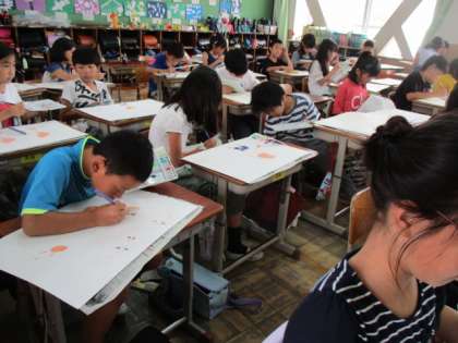 野外炊事や磯観察,キャンプファイヤー,梅津北小学校との交流など,たくさんの思い出を描いています。
