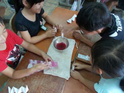でてきたきれいな赤紫の色水に,たたんだ和紙をつけて,染めました。
