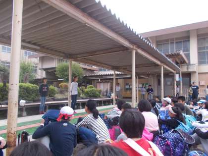 大勢の保護者の方々に見守られ,立派に出発の言葉を発表することができました。いよいよ「山の家」に向けて,出発します。