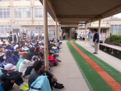 「花背山の家 長期宿泊自然体験活動」が始まります。78名の児童が全員元気に登校し,予定より10分早く出発式を行いました。