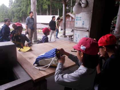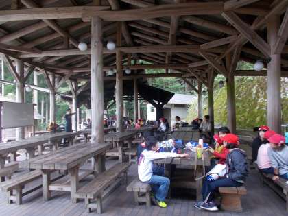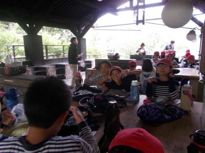 学級写真を撮った後,第一炊飯場で昼食です。お昼には少し早いのですが,みんなおなかペコペコだった様子で,愛情いっぱいのおにぎりを,おいしそうにほおばっていました。
