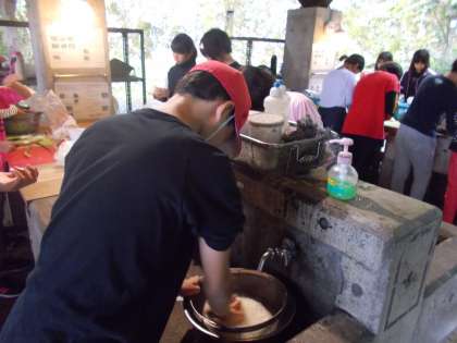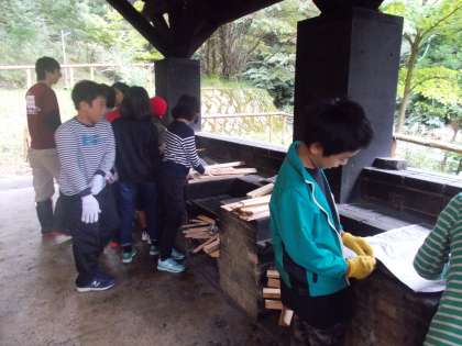 準備に取りかかります。材料を切る係・お米を洗って水加減の調整をする係・かまどに火をおこす係・・・みんなとても真剣です。