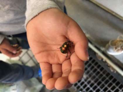 昼食のカレー作りのために,第一炊飯場に来ました。黄金色に輝く美しい虫をみつけました。
