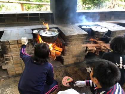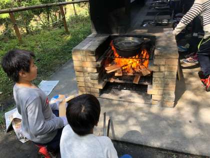 かまど係です。薪を上手に組んで,火の準備はばっちりです。