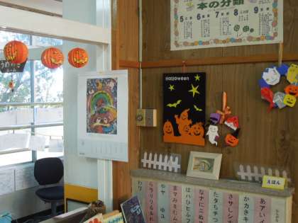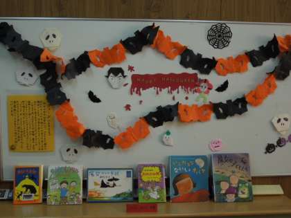 10月に入り,ほんのもり,ハロウィンの飾りつけになりました。ぐっと季節が進みました。飾りの下には,お化け・魔女等々の本も,たくさん出ています。手にとって見てください。