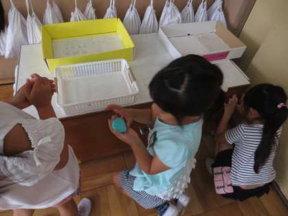 「顔に見える!」「このでこぼこはハンバーグみたいやなぁ」など,友だちとわいわい言いながら,うつしていました。