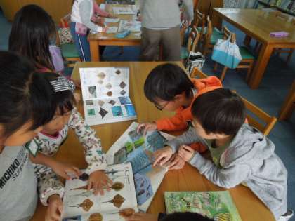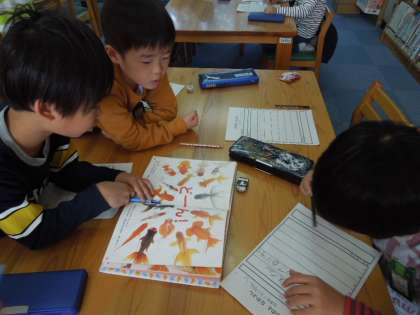 学校の中庭で見つけた,ウサギ,コイ,メダカ,タニシなどを本で調べることも始めました。生活科と国語科の学習をつなげたのです。生活科では,生物を見つけたり,さわったりしました,国語科では本を見て,驚いたり,納得したりして生き物について調べる学習の楽しさを味わいました。