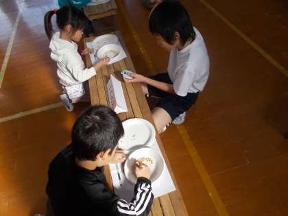 今週は給食週間です。毎日おいしくいただいている給食に改めて感謝の気持ちをもってすごしています。中間休みに行われた豆つまみ大会では,おはしを上手に使って素早く大豆をつまめている子どもが多く見られました。普段の食事から,正しいおはしの持ち方,食事のマナーを意識して,食べることを楽しんでほしいと思います。